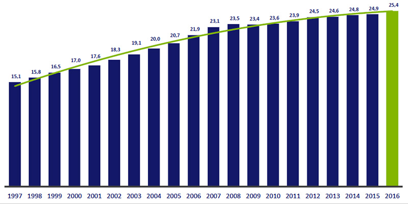 Quest’anno, 2017, il mercato del bricolage in Francia si chiuderà a 25,4 miliardi di euro e una crescita, sul 2016 dell’1,9%. Un mercato maturo con le GSB in posizione di dominanza con una quota di mercato del 77%.
