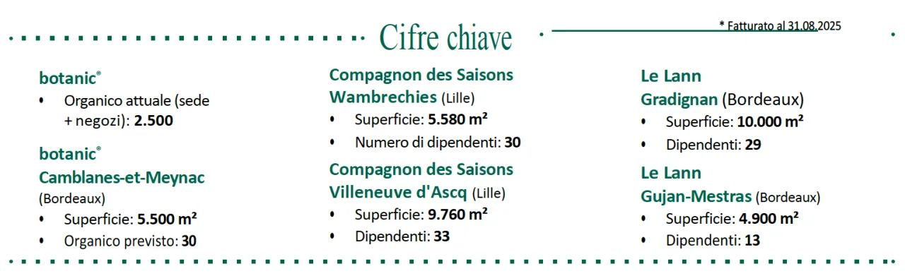 botanic® si conferma oggi tra i principali player francesi del giardinaggio responsabile, con un fatturato di 438 milioni di euro al 31 agosto 2025 e un organico di circa 2.500 addetti. Dal 2021 il gruppo opera come società a missione, con la finalità dichiarata di avvicinare il pubblico alla natura attraverso un’offerta che integra giardino e orto, piante e decorazione, pet care e alimentazione biologica.