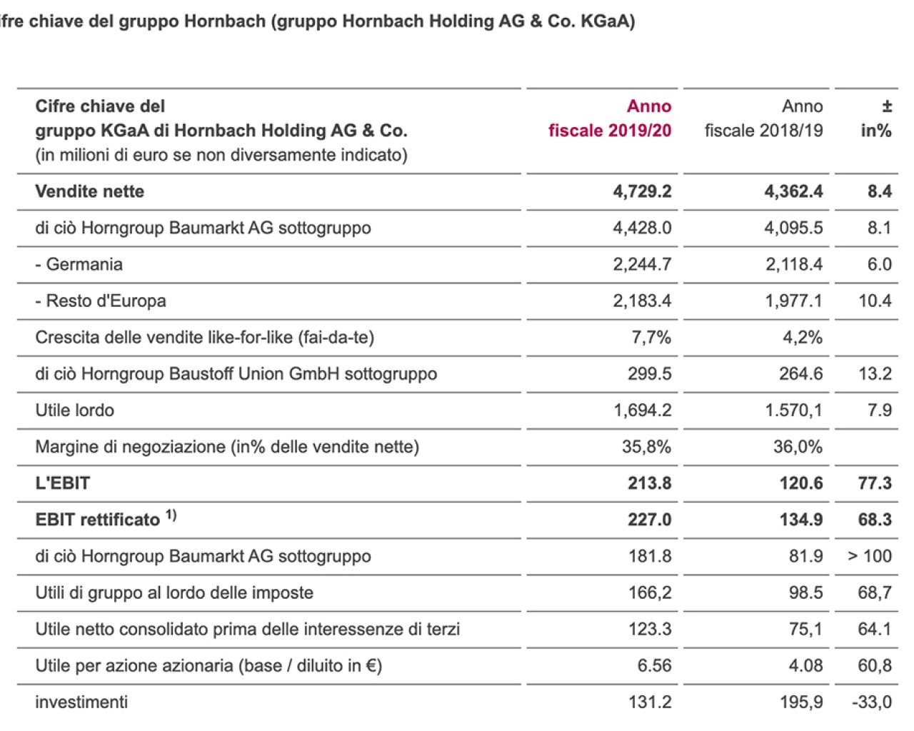 Il gruppo Hornbach ha soddisfatto le previsioni di vendita 2019/20 con un aumento dell’8,4% delle vendite nette a 4.729 milioni di EUR. Hornbach Baumarkt AG, con 160 megastore brico, garden center e negozi online in nove paesi alla data di bilancio del 29 febbraio 2020, ha aumentato le vendite dell’8,1% a 4.428 milioni di EUR.