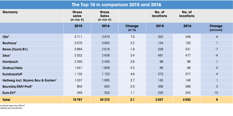 Qui sotto riportiamo il confronto dei risultati delle prime 10 insegne del bricolage tedesche, tra il 2015 e il 2016.