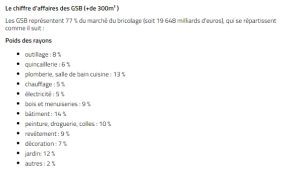 All’interno del segmento GSB, il Leroy Merlin è la prima insegna con il 34%, seguita a distanza da Castorama con il 17%. Seguono Brico Depot, con il 14%, Bricomarché con il 9%. In ogni caso, la situazione mostra una significativa concentrazione, dato che 3 sono le grandi aggregazioni del comparto GSB francese: Adeo, considerando anche Weldom con il 4% e Bricoman con il 3%) detiene il 41% di quota di mercato; Castorama e Brico Depot ( 31%); Bricomarché e Bricorama che, dallo scorso anno, fanno parte dello stesso gruppo con una quota del 12%: infine Mr Bricolage con il 7%.
