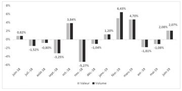 Secondo il rapporto, la crescita più forte nei primi sei mesi del 2019 è avvenuta a febbraio, quando le vendite sono aumentate del 5,01%. Il calo maggiore è stato in aprile con una flessione dell’1,80%.