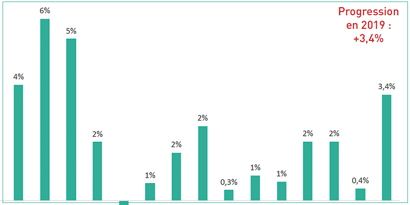 Tuttavia le differenze di prestazioni tra i canali distributivi si stanno riducendo e dopo un 2018 stazionario, il tasso di progressione della GSB francese è stato del 2,5, molto vicino a quello dei Négoces che hanno registrato un aumento del 3,5%. Inoltre, dopo anni di crescita, la dinamica del settore e-commerce sta rallentando (+11,8% contro il 18% del 2018). Bisognerà aspettare per capire se il 2020 riporterà questa cifra in forte crescita.