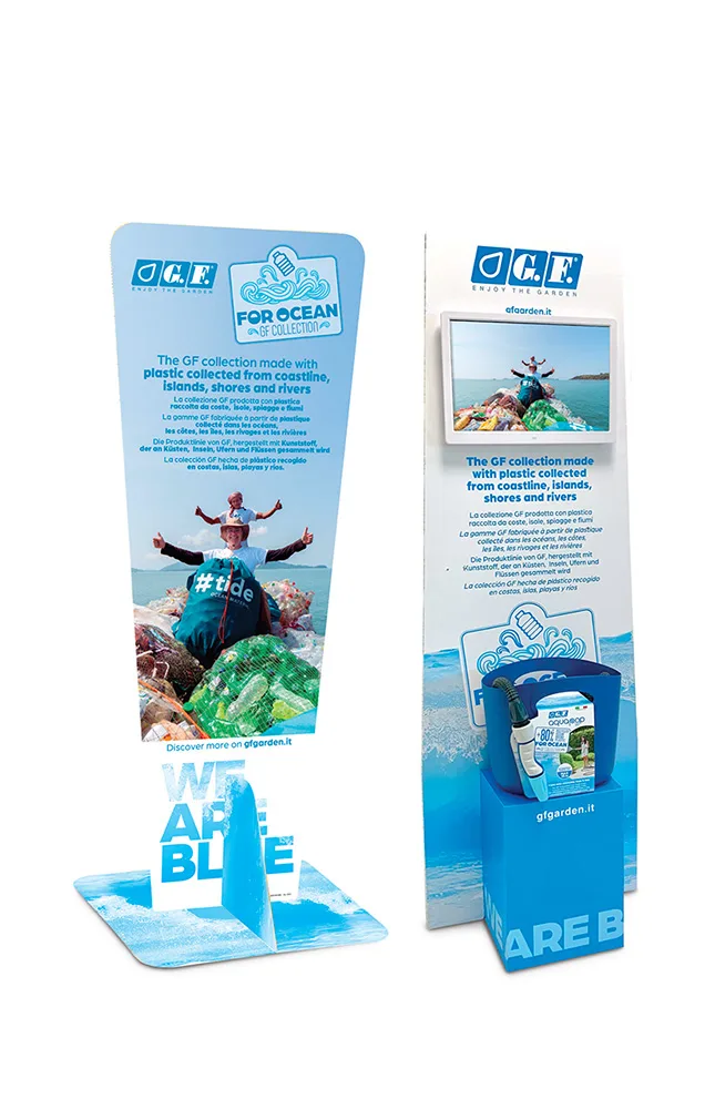 Per i punti vendita G.F. ha predisposto appositi espositori e un merchandising dedicato che enfatizza valori e caratteristiche del progetto For Ocean.