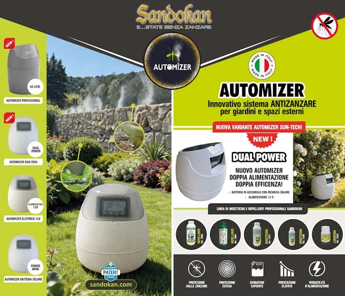 Tra le novità di maggiore interesse figura il nuovo Automizer professionale da 40 litri, progettato per applicazioni su superfici estese. Il sistema è disponibile sia con alimentazione a 12V (tramite trasformatore da 230V) sia in versione a dual-power, che integra 12V e pannello solare. Le caratteristiche operative consentono di raggiungere coperture fino a 2.500 mq, rendendolo adatto a vivai, grandi aree verdi, strutture commerciali, contesti horeca e applicazioni agricole.