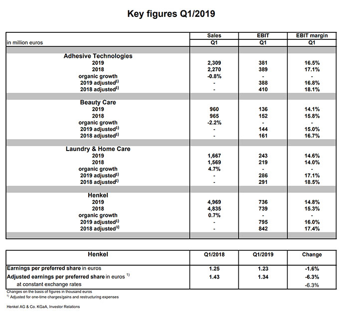 Il fatturato organico della divisione Adhesive Technologies è calato dello 0,8%, principalmente a causa del rallentamento del settore elettronico e dell’automotive. Le vendite della business unit Beauty Care sono state inferiori del 2,2% in termini organici a quelle dello stesso trimestre 2018, scontando in particolare la debolezza dei mercati al consumo in Europa occidentale e Cina. La divisione Laundry & Home Care ha invece registrato una crescita organica importante, pari al 4,7%, sostenuta dal lancio di nuovi prodotti e innovazioni in diversi mercati chiave.