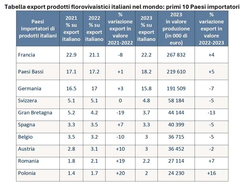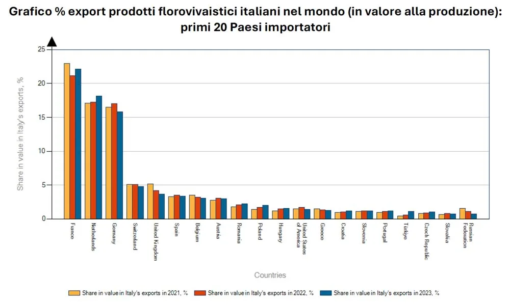 Il Vecchio Continente è anche il principale mercato di approvvigionamento per l’Italia: i Paesi Bassi sono il principale fornitore di prodotti florovivaistici (ca 69% dell’import totale in Italia), seguiti da Spagna (ca 7.3%, in crescita di 1 punto percentuale), Francia (5.2%, in leggera crescita), Germania (4.6%, in leggero calo) e Polonia (3.3% in crescita).