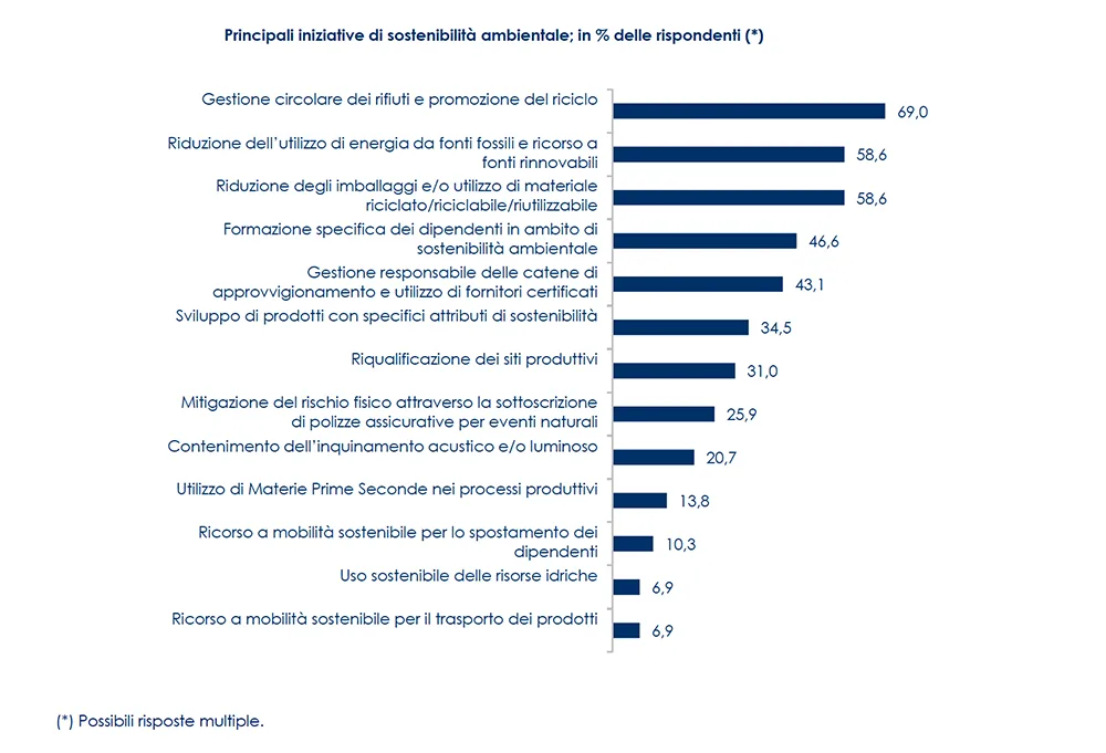 Il 79,5% delle aziende ha avviato un’attività di sensibilizzazione sulle tematiche ESG, con un focus particolare sulle tematiche green dove emergono gli impegni per la gestione responsabile dei rifiuti (69%), la riduzione di fonti fossili e di imballaggi e il contestuale ricorso alle rinnovabili e al materiale riciclato/riciclabile/riutilizzabile (58,6%).