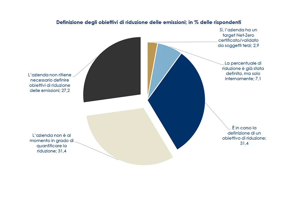 Attualmente, il 41,4% delle imprese è già impegnato nella definizione dei propri obiettivi di riduzione delle emissioni: il 31,4% è in itinere, il 7,1% vi ha già provveduto solo internamente e il 2,9% ha anche ottenuto la validazione da terzi. Tuttavia, il 31,4% delle aziende non è ancora in grado di quantificare tali obiettivi e il 27,2% non ritiene al momento necessario impegnarsi in questa attività.