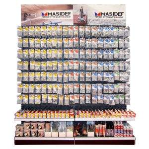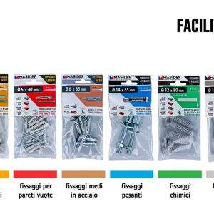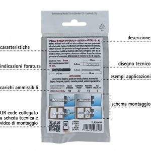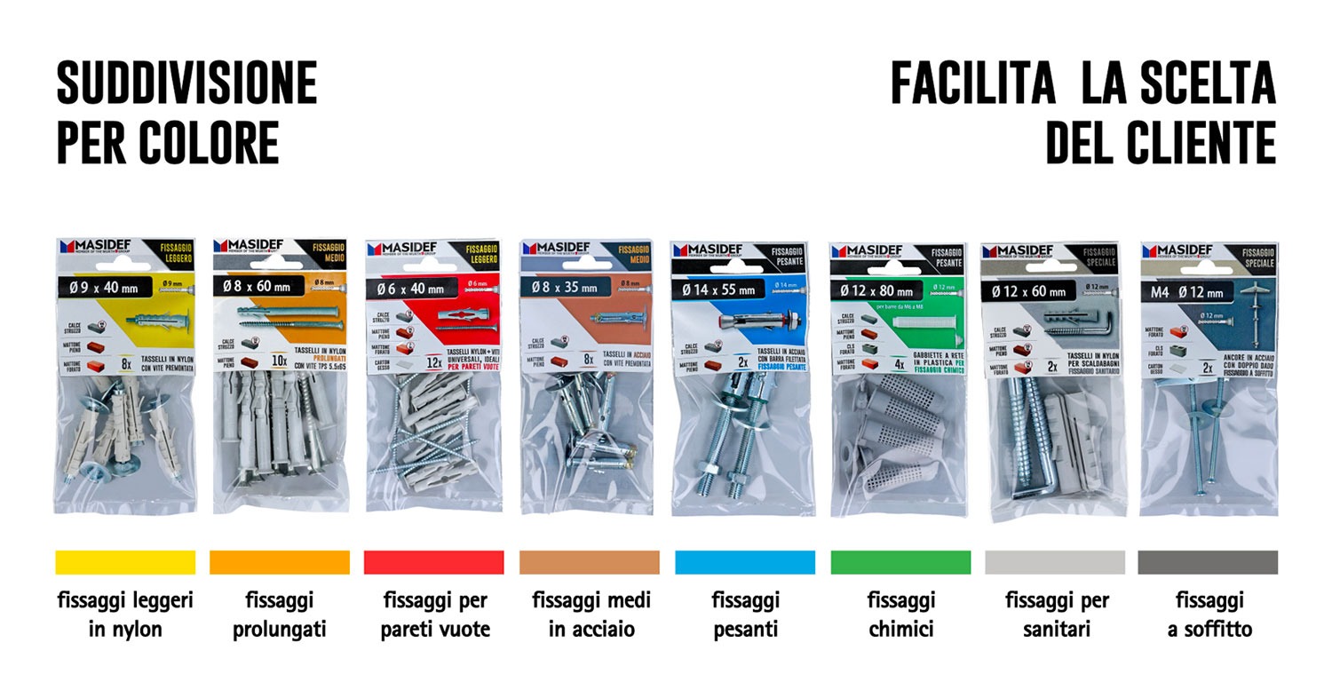 Una volta di fronte al modulo, il cliente trova l’offerta esposta secondo una suddivisione cromatica. L’azienda ha lavorato sul colpo d’occhio, il colore, cui corrisponde il tipo di fissaggio, le misure, i tipi di supporto. Il prodotto è ben visibile dalla confezione; confezione che, sul retro, riporta tutte le informazioni necessarie, come gli esempi di applicazione, le indicazioni di foratura e le caratteristiche.