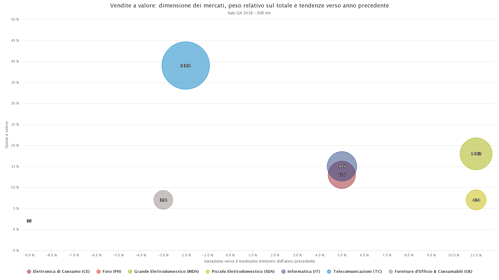 Nel grande elettrodomestico, lavatrici, asciugatrici e frigoriferi sono i prodotti a più rapido incremento, cui ha contribuito anche il “black friday”; per il piccolo elettrodomestico, settore trainato dai segmenti cura casa e cura persona, il trend positivo è sostenuto da prodotti per l’igiene dentale, asciugacapelli, piastre per capelli, rasatura maschile, mentre scope elettriche e robot primeggiano nel comparto aspirapolvere, in forte crescita. Crescono anche l’informatica e l’elettronica di consumo, il settore telecomunicazioni con core wearable e cuffie con microfono e le forniture di cartucce per stampanti.