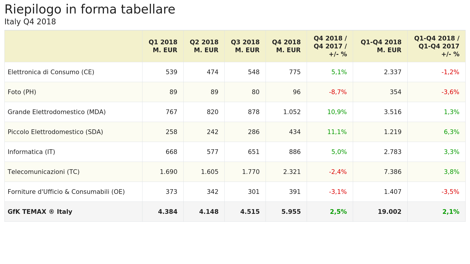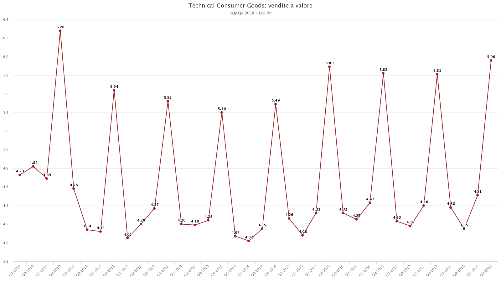 Secondo i dati di GfK Temax, nel quarto trimestre del 2018 il mercato italiano della tecnologia di consumo ha registrato una robusta crescita (+2,5%), sviluppando un giro d’affari di 5,9 miliardi di euro. Il piccolo elettrodomestico (+11,1%) e il grande elettrodomestico (+10,9%) si attestano come i settori con crescita maggiore.
