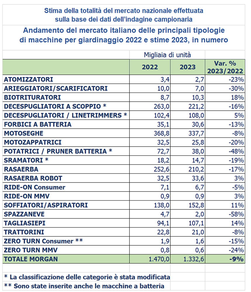 I dati sull’andamento del settore, forniti dal gruppo di rilevamento statistico Morgan ed elaborati dall’associazione dei costruttori Comagarden, che comprende la gran parte delle case costruttrici, indicano per il settore una contrazione complessiva del 9% per un totale di 1.333.000 unità vendute nel 2023 (l’anno precedente erano state 1.470.000).