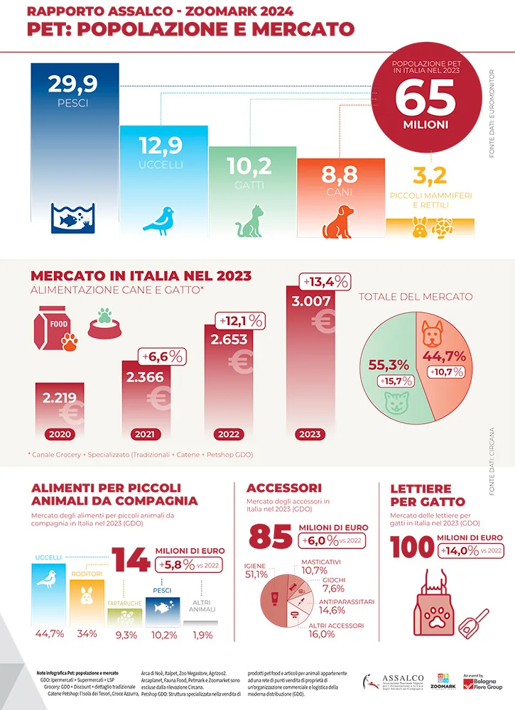 Trenta milioni di pesci, 13 di uccelli e 3 tra piccoli mammiferi e rettili: secondo i dati Euromonitor agli italiani dunque non piacciono “solo” cani e gatti, anzi. Basti pensare che nel 2023 il mercato degli alimenti per questi animali da compagnia è cresciuto di quasi il 6% a valore, con un fatturato che si aggira intorno ai 14 milioni di euro nella gdo.