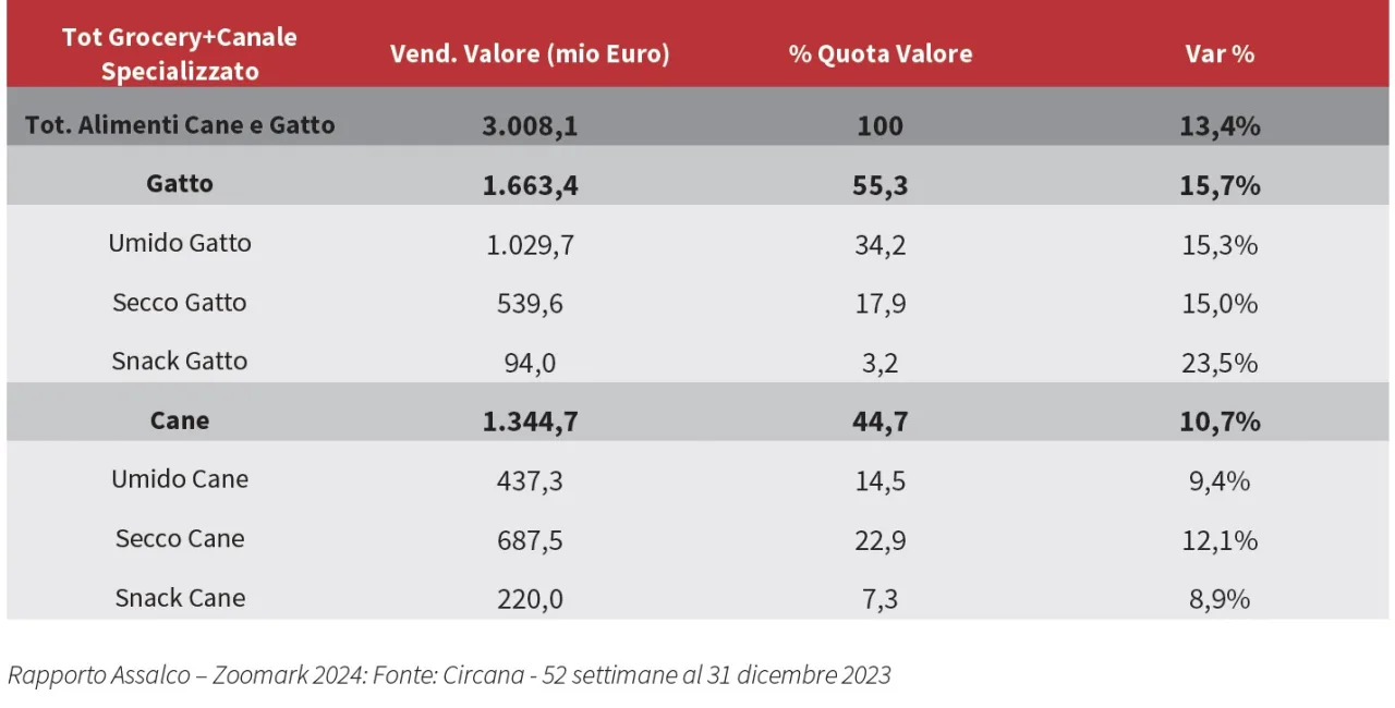 Gli alimenti per gatti rappresentano oltre il 55% del valore complessivo, con un fatturato di poco più di 1.663 milioni di euro, mentre gli alimenti per cani sono al 44,7% del mercato totale (1.344 milioni di euro).