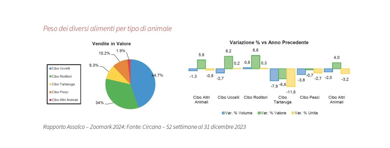 Il segmento principale rimane quello degli alimenti per uccelli – quasi il 45% del valore –, al secondo posto gli alimenti per roditori con il 34% del totale.