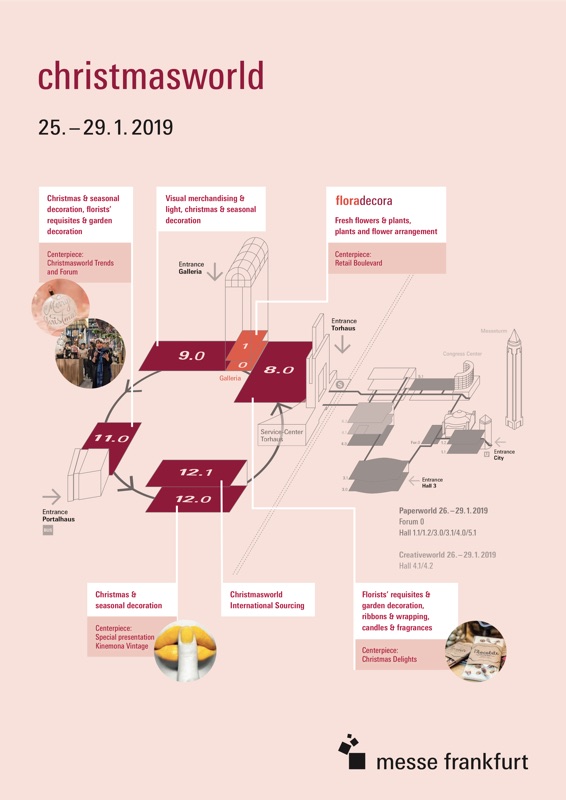 “Con il nuovo concept della manifestazione intendiamo anche rafforzare il ruolo di Christmasworld quale principale fiera commerciale e trendsetter del settore e allo stesso tempo consolidare il suo status di evento – aggiunge Eva Olbrich, direttrice di Christmasworld, Messe Frankfurt Exhibition GmbH. In quest’ottica il programma di eventi collaterali di Christmasworld, tra cui il trend show e la nuova mostra ‘Kinemona Vintage’ (letteralmente giallo zafferano, colore di tendenza), sarà integrato all’interno dei padiglioni espositivi, fornendo così ulteriori fonti di ispirazione e garantendo una maggiore affluenza di visitatori. Floradecora, il marketplace di fiori freschi, piante ornamentali e composizioni floreali, sarà ospitata sempre nella Galleria, nel ‘cuore’ di Christmasworld”.