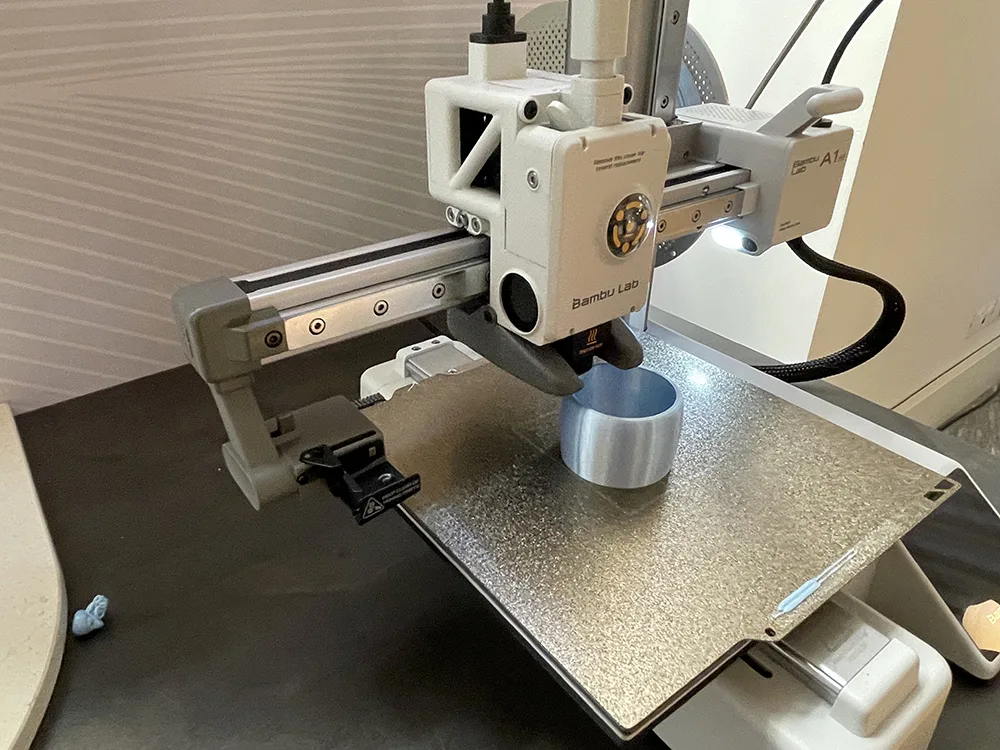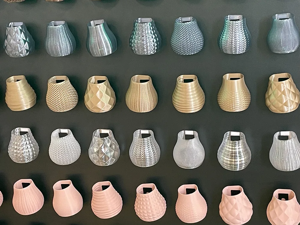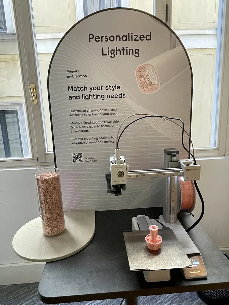 Oltre alle diverse lampade ambientate, nell’ambito dell’installazione Signify ha costruito un percorso guidato lungo il quale tre stampanti 3D in azione consentono di vedere il processo di produzione, i granuli plastici della materia prima utilizzata, trasformati poi in filamenti idonei ad essere lavorati dalla stampante 3D.