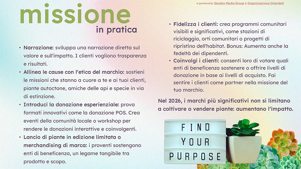Il Garden Trends Report 2026 invita i professionisti a considerare il giardinaggio come un campo in cui innovazione, emozioni e scopo si intrecciano. Per garden center, produttori e distributori significa sviluppare proposte capaci di combinare estetica, funzionalità e valori condivisi, incontrando i consumatori in un momento storico in cui la ricerca di significato è più forte che mai.