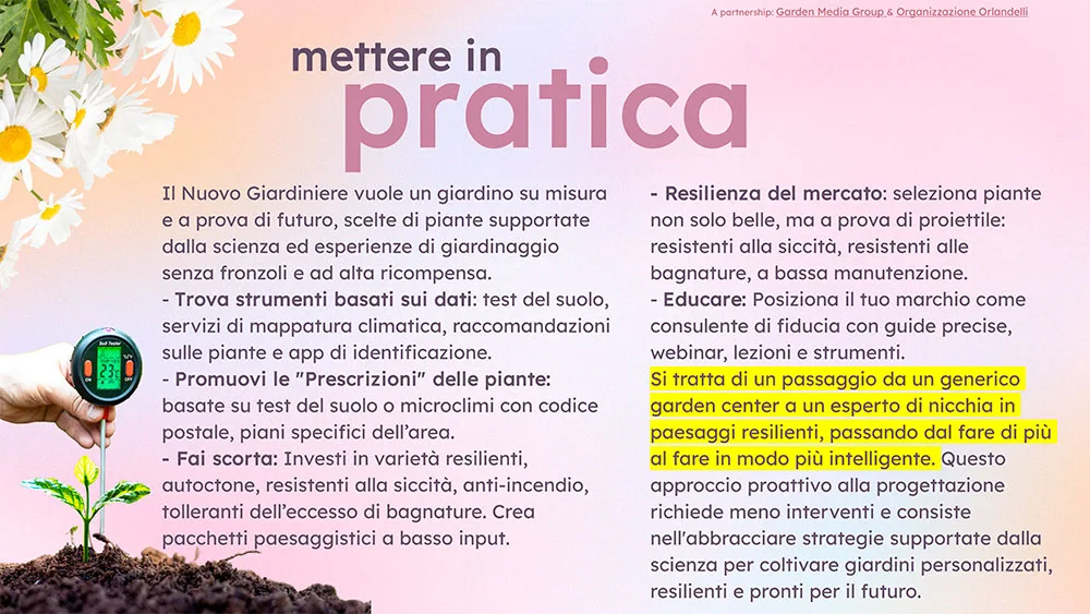 Un’altra direttrice è quella del giardinaggio di precisione, che applica al verde logiche simili a quelle della medicina personalizzata. Attraverso dati, sensori, mappe climatiche e strumenti digitali, è possibile scegliere piante e soluzioni adatte a microclimi e condizioni specifiche. Un approccio che consente di risparmiare risorse e distinguersi sul mercato, rispondendo al crescente bisogno di paesaggi resilienti e sostenibili.