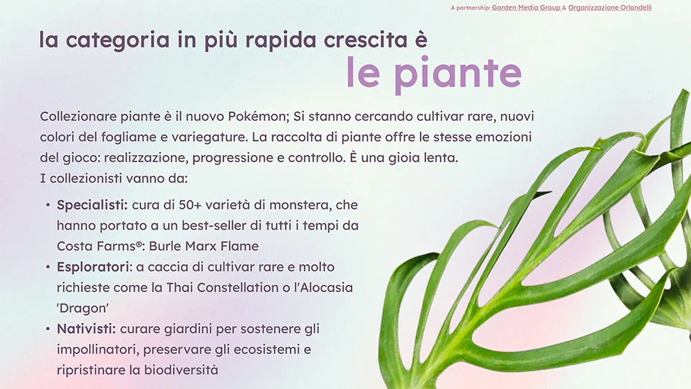 - Collezionismo green: piante rare, cultivar particolari e materiali naturali diventano oggetti da collezione, in linea con la tendenza al “museo personale”.