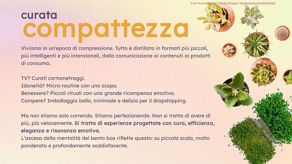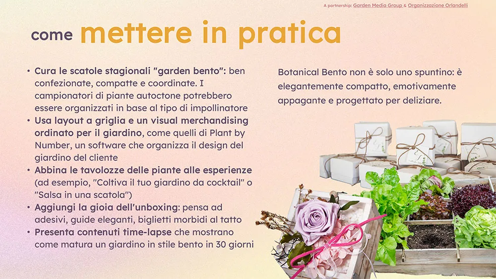 - Botanical bento: esperienze compatte e curate, ispirate al concetto delle bento box giapponesi, che trasformano il giardino in un insieme di piccoli rituali organizzati.