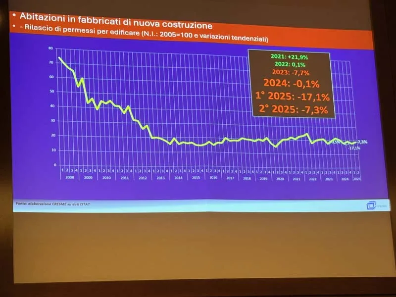 Sul fronte della nuova costruzione, i numeri sono drasticamente calati rispetto al 2008, quando si costruivano quasi 400.000 case all’anno. Oggi, secondo l’ISTAT, si costruiscono tra 55.000 e 65.000 abitazioni, mentre il CRESME stima una produzione intorno alle 90.000 unità.