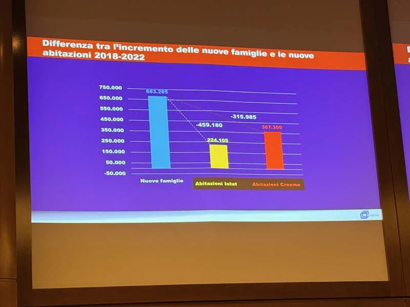 Uno dei punti più rilevanti dell’analisi riguarda la domanda abitativa, spesso mal interpretata. “Non è la popolazione che produce domanda abitativa, sono le famiglie”, ha chiarito Bellicini presentando dati significativi: tra il 2018 e il 2022 lo stock di famiglie in Italia è cresciuto di 683.000 unità, mentre nello stesso periodo sono state realizzate solo 224.000 case secondo l’ISTAT (367.000 secondo le stime CRESME). “Solo per l’incremento abbiamo 315.000 famiglie che devono trovare collocazione dentro lo stock esistente”.