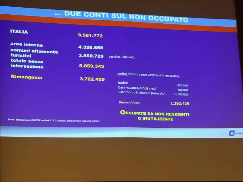 Quanto al tema delle case vuote, Bellicini ha smontato alcuni luoghi comuni: “Dei 9,6 milioni di case non occupate, 4,3 milioni sono nelle aree interne del paese dove non c’è problema di domanda abitativa ma di spopolamento, mentre 3,55 milioni sono in comuni turistici. Il 26% delle famiglie italiane ha la casa al mare o in montagna”. Eliminando sovrapposizioni, ruderi (630.000), affitti brevi (800.000) e patrimonio frizionale (1 milione), rimangono circa 1,2 milioni di unità effettivamente disponibili, ma con condizioni spesso problematiche.
