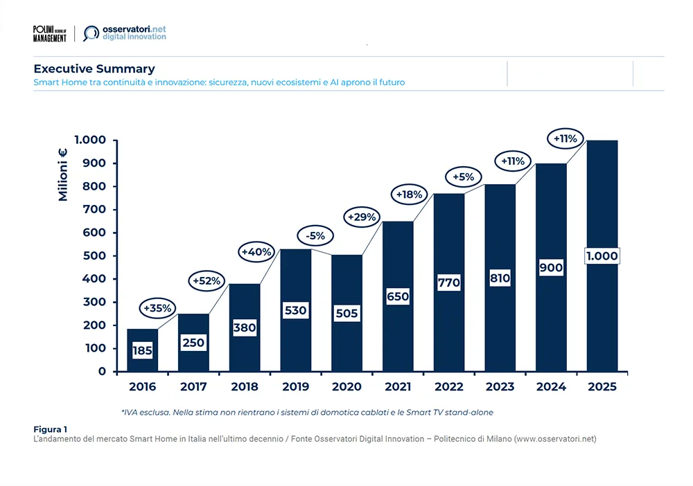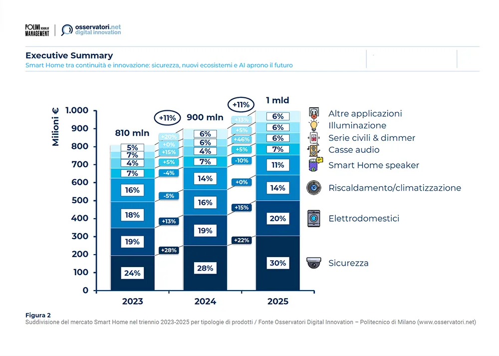 Il mercato italiano della Smart Home continua, infatti, a crescere a doppia cifra e supera per la prima volta la soglia simbolica del miliardo di euro, ma lo fa all’interno di un contesto che richiede nuovi modelli di business, competenze evolute e una forte spinta verso servizi digitali e soluzioni basate sull’Intelligenza Artificiale.