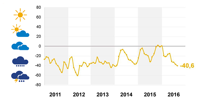 Nel complesso, il dato risulta in calo di 9,3 punti dal giugno di quest’anno e di ben 25,2 punti rispetto a settembre 2015. A pesare su questo clima di scarsa fiducia sono sicuramente il persistere della crisi economica e finanziaria e l’arrivo di un elevato numero di migranti.