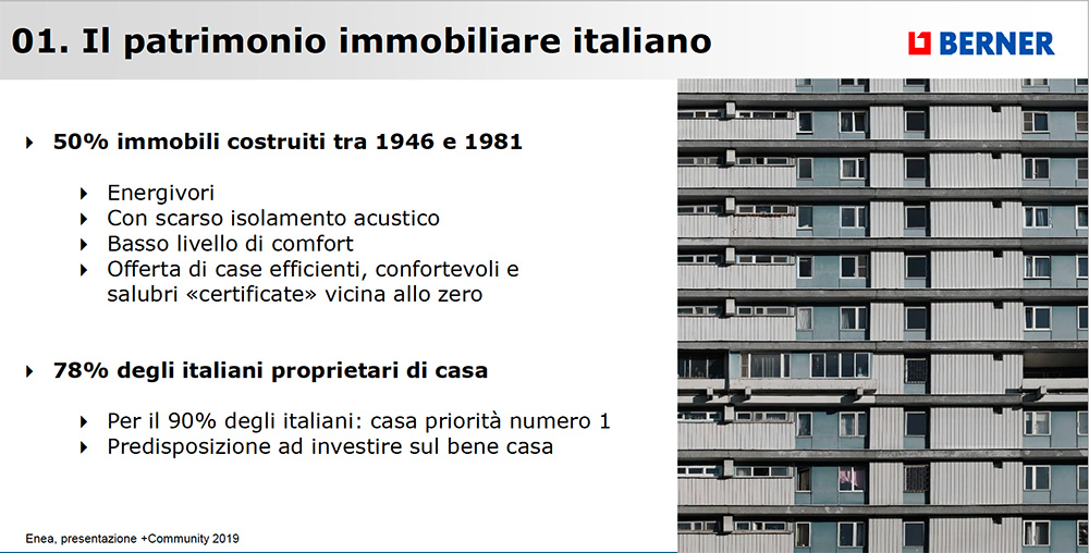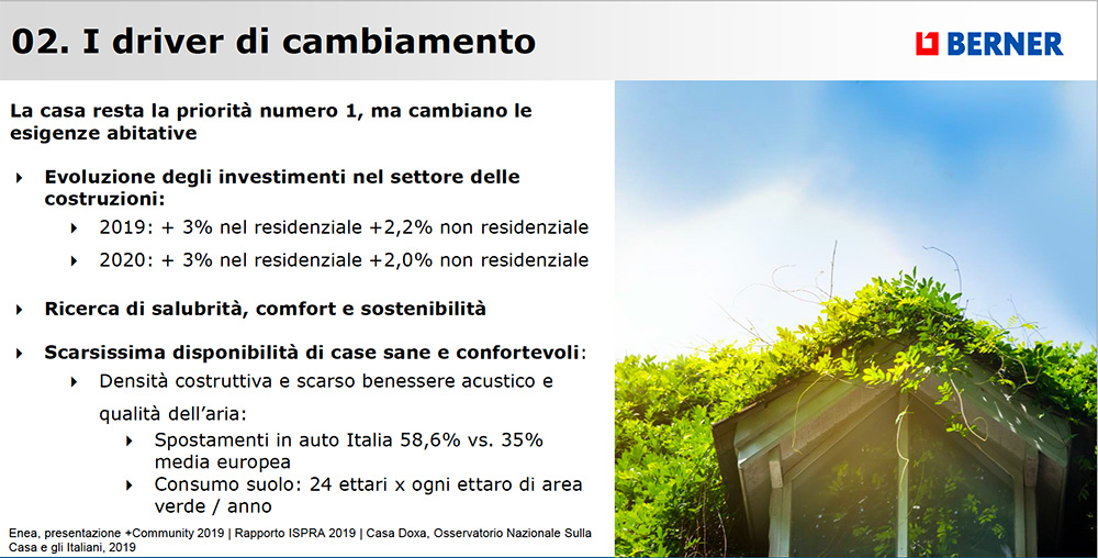 “I dati di mercato riferiti alle esigenze degli italiani nel mondo dell’abitare sono molto importanti per aziende come la nostra e anche per i nostri clienti. Cresce infatti la domanda per sistemi di qualità che garantiscano prestazioni eccellenti e durata nel tempo. Anche l’incremento di lavori effettuati con imprese e artigiani specializzati – considerati in grado di garantire una posa a regola d’arte e risultati durevoli – è una conferma in questo senso. Assume quindi sempre più importanza l’esigenza di una posa qualificata e competente, in assenza della quale anche il prodotto di qualità maggiore non sarebbe in grado di garantire determinate prestazioni.” afferma Antonio Zuffellato, Direttore Marketing di Berner Italia.