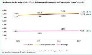 In particolare, secondo l’Osservatorio, la spesa per veicoli si è assestata a circa 38 miliardi di euro con una crescita del 3,1%, (valore) e del 3,8 (volumi) ed è quella più importante. La spesa destinata al comparto dei beni durevoli per la casa -mobili, elettrodomestici, telefonia, fotografia, elettronica di consumo, information technology e bricolage – ha rallentato la crescita del fatturato (+1,0% nel 2017 per un valore di 33 miliardi di euro) registrando un calo dei volumi (-1,3%).