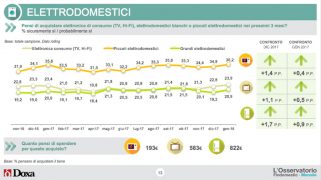 Il 2018 parte con il botto per il comparto ‘elettrodomestici’: rispetto a dicembre, le intenzioni di acquisto schizzano a +1,4% per i piccoli elettrodomestici, +1,1% per tv e Hi-fi e +1,7% per i grandi elettrodomestici. Il boom riporta in positivo il saldo tendenziale del comparto.