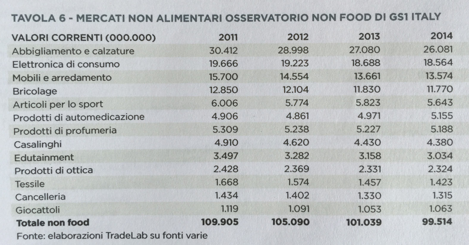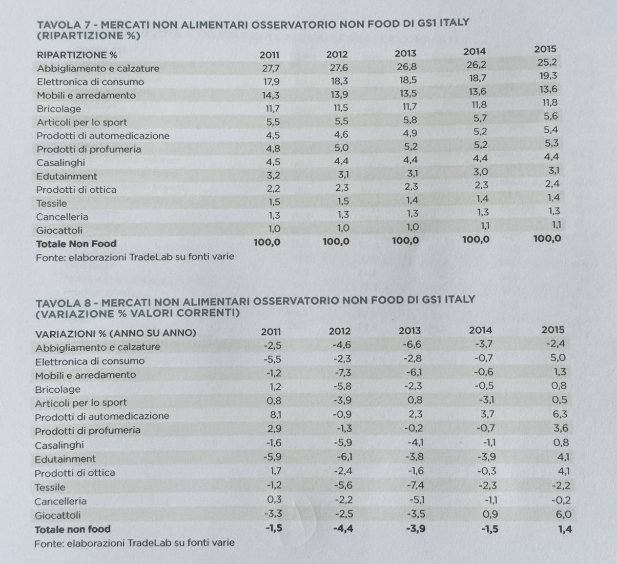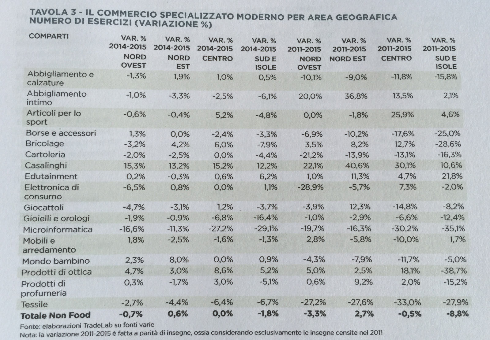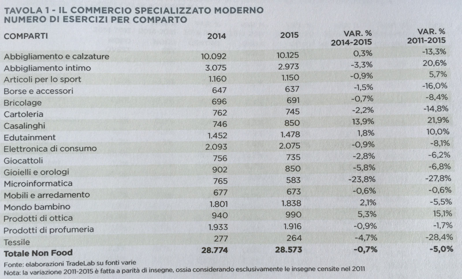 Partiamo dai punti vendita. In generale il comparto Non Food, a fine 2015, conta poco più di 459 mila punti vendita, circa 3,9 mila esercizi in meno rispetto al 2014 (furono il doppio).