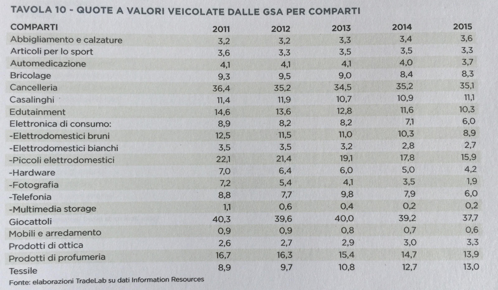 In termini di valori, le elaborazioni di Trad Lab su fonti varie, il nostro comparto chiude il 2015 con 11,860 miliardi di euro e un incremento dello 0,8% rispetto agli 11,770 miliardi di euro dello scorso anno. Un dato che assume una maggiore positività nei consumi, se confrontato con il negativo 0,5% del 2014 e che rappresenta il quarto comparto del Non Food (l’11,8% sul totale valore), dopo abbigliamento/calzature, elettronica di consumo e mobili/arredamento.