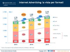 L’Internet advertising (inteso come la somma dei fatturati derivanti dalla vendita di spazi pubblicitari online) ha raggiunto i 2,15 miliardi di euro (+11%), rafforzando così la sua posizione di secondo mezzo pubblicitario italiano con una quota del 29% (rispetto al 27% nel 2014), alle spalle della Televisione, che continua a valere il 49% (50% nel 2014) ma sempre davanti alla Stampa che scende al 17% (18% nel 2014) e alla Radio (stabile al 5%). Nel 2016 si stima che l’Internet advertising crescerà ancora di circa l’11% avvicinandosi ai 2,4 miliardi di euro.