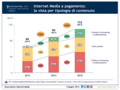 Naturalmente tutta questa attenzione e questi discorsi sull’advertising online sono fondamentali in Italia perché nei consumatori di contenuti esiste ancora e stabilmente il concetto secondo cui il contenuto internet deve essere gratuito. Sono pochi gli italiani che oggi sono disposti a pagare per accedere a contenuti internet, anche se giudicati interessanti. Tant’è che nell’ambito del giro d’affari generato dalla rete i contenuti a pagamento, con soli 112 milioni di euro, rappresentano pochi punti percentuali rispetto all’advertising classicamente inteso.