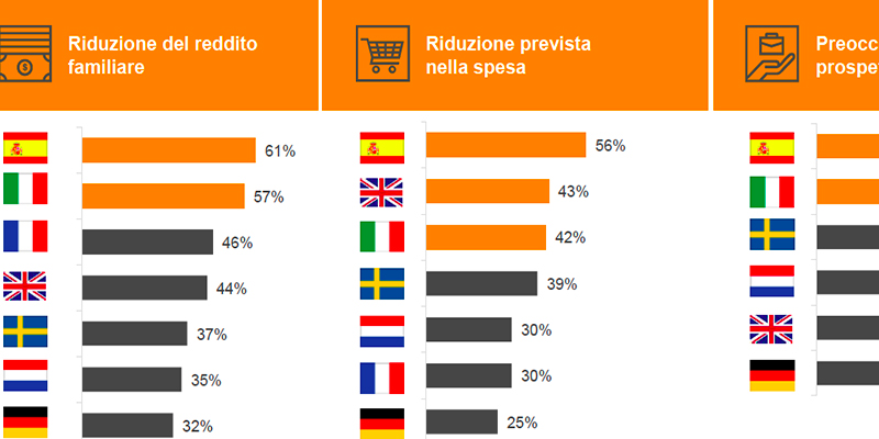 Nei Paesi del Nord i redditi delle famiglie sono stati meno colpiti (il 34% in Germania, 38% in Olanda) e i consumatori ridurranno le spese nei prossimi mesi (25% in Germania, 30% in Olanda). Al contrario in Spagna e Italia il 60% ha subìto una riduzione delle entrate. La spesa per grocery è aumentata per il 64% degli italiani (seguita dal 35% su entertainment & media e 27% su food delivery o pickup). L’abbigliamento in Italia è il comparto è il più penalizzato, con il 58% dei consumatori che ha scelto di ridurre il budget.