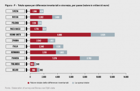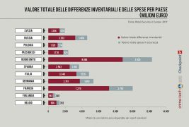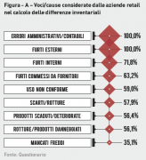Se confrontate con il fatturato totale delle aziende, le perdite totali relative alle differenze inventariali rappresenterebbero il quarto maggior retailer per dimensione in Europa. Tra i settori che presentano i più alti tassi di differenze inventariali: gli alimentari (2,0%) e l’abbigliamento (1,4%); quelli che registrano i tassi più bassi: elettronica (0,4%), bellezza e cosmesi (0,5%) e articoli sportivi (0,7%). Il valore delle differenze inventariali analizzato comprende furti esterni ed interni, ma anche errori amministrativi, uso non conforme, scarti, merci scadute e merci e prodotti freschi danneggiati. (1. Cause differenze inventariali)