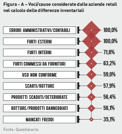 Se confrontate con il fatturato totale delle aziende, le perdite totali relative alle differenze inventariali rappresenterebbero il quarto maggior retailer per dimensione in Europa. Tra i settori che presentano i più alti tassi di differenze inventariali: gli alimentari (2,0%) e l’abbigliamento (1,4%); quelli che registrano i tassi più bassi: elettronica (0,4%), bellezza e cosmesi (0,5%) e articoli sportivi (0,7%). Il valore delle differenze inventariali analizzato comprende furti esterni ed interni, ma anche errori amministrativi, uso non conforme, scarti, merci scadute e merci e prodotti freschi danneggiati. (1. Cause differenze inventariali)