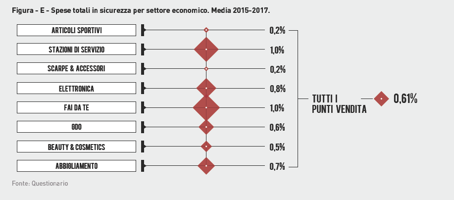 Anche in Italia, il settore degli alimentari riscontra il tasso di perdita più elevato (il 2,4% nel 2017, con un aumento dello 0,1% rispetto al 2015); l’abbigliamento e gli altri settori registrano valori simili per le differenze inventariali (0,8% nel 2017) e mostrano una tendenza costante nei tre anni. I punti vendita che si trovano nelle province di Genova, Milano, Imperia, Bologna e Napoli mostrano i valori delle differenze inventariali più elevati per il 2017. Tra le cause delle differenze inventariali, troviamo in pole position il taccheggio, seguito da furto con scasso e rapina. Oltre al “grab and run” – che potrebbe essere tradotto con “prendi i soldi e scappa” – gli altri metodi sono la rottura di etichette/placche antitaccheggio e l’uso di borse schermate. La maggior parte degli intervistati italiani sottolinea anche il problema delle micro-bande, composte da 3-4 persone, spesso attrezzate con distaccatori di etichette antitaccheggio, jammer, magazzini dove conservare la merce rubata. I retailer italiani spendono in media lo 0,5% del loro fatturato in misure di sicurezza, che sono in linea con il resto dei Paesi europei: sistemi di videosorveglianza, seguiti dall’EAS e dagli allarmi. (4 istogramma spese)