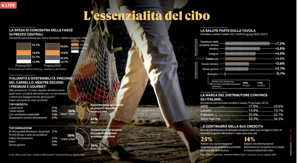 Presentato in anteprima lo scorso 8 settembre, redatto dall’Ufficio Studi di Ancc-Coop con la collaborazione scientifica di Nomisma, il supporto di analisi di Nielsen e i contributi originali di Gs1-Osservatorio Immagino, Iri Information Resources, Mediobanca Ufficio Studi, Nomisma Energia, Npd, il Rapporto Coop 2022 – Consumi e Stili di Vita degli Italiani di Oggi e di Domani vuole essere una sorta di istantanea, come sottolineato durante la presentazione da Albino Russo, direttore generale Ancc Coop, dei consumatori italiani in un momento particolarmente difficile.