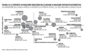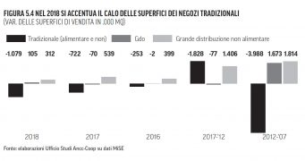 Tuttavia, il negozio tradizionale, alimentare e non, pur rappresentando ancora il 57% del totale dell’area di vendita, nel solo 2018 è calata di oltre 1.000.000 di mq. Ancora più evidente se si calcola il periodo 2007-2017 con quasi 6.000.000 di mq di superficie di vendita persi. Le regioni che hanno subito la flessione maggiore sono: Friuli Venezia Giulia, Abruzzo, Marche e Sardegna.