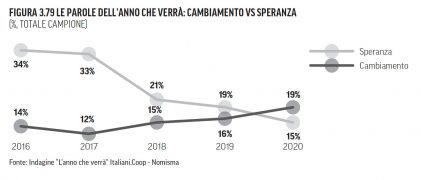Ostaggi di una economia che non assicura lavoro e redditi soddisfacenti, preoccupati per l’immigrazione, i rischi climatici e la fragilità del quadro istituzionale e politico gli italiani sono stanchi di limitarsi a sperare in un anno migliore (la “speranza” non è più al primo posto degli eventi che si aspettano nell’anno che verrà e dimezza in 5 anni il suo indice di gradimento) e anzi guardano ai prossimi 12 mesi con propositi di cambiamento soprattutto nella sfera personale: il “cambiamento” passa dal 14% delle citazioni del 2016 al 19% del 2020.