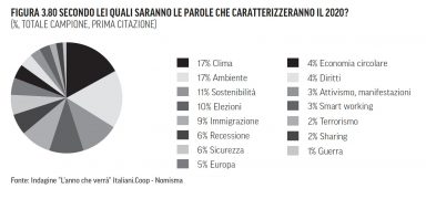 Clima, ambiente e sostenibilità, sono queste le tre parole che per gli italiani caratterizzeranno il 2020, sulla scia dei nuovi valori imposti dai ragazzi della Generazione Greta al resto della società italiana. Anche (ma non solo) a questi valori è improntato quel bisogno sempre più pressante di “cambiamento” espresso dagli italiani (dal 14% del 2016 al 19% di oggi) tanto da scalzare per la prima volta dal top della classifica la mera “speranza” di un miglioramento.
