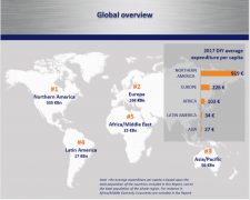 Nord America e l’Europa, insieme, rappresentano circa l’85% di questo mercato, sebbene la loro popolazione congiunta rappresenti solo il 15% della popolazione mondiale. I mercati fai-da-te di questi due continenti sommano 503 miliardi di € e raggiungono rispettivamente il 60% e il 28% del mercato mondiale.