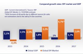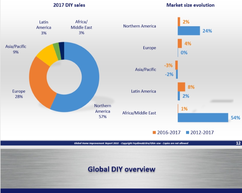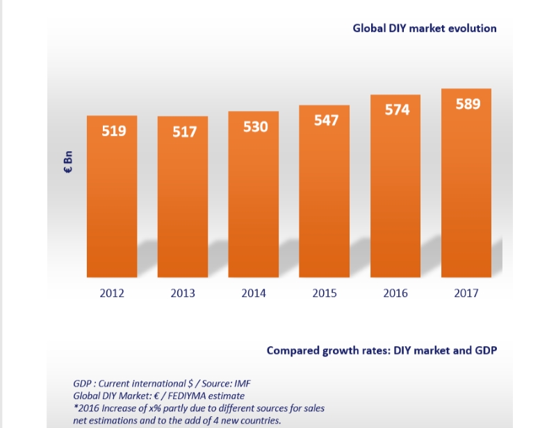 E’ fresco di stampa il consueto “Global Home Improvement Report 2018” realizzato dalle associazioni internazionali di categoria, fedyma, EDRA e Ghin. Nel 2017, il fatturato del mercato mondiale del fai-da-te / casa ha raggiunto la cifra di 589 miliardi di euro, con un incremento del 2,6% rispetto allo scorso anno.