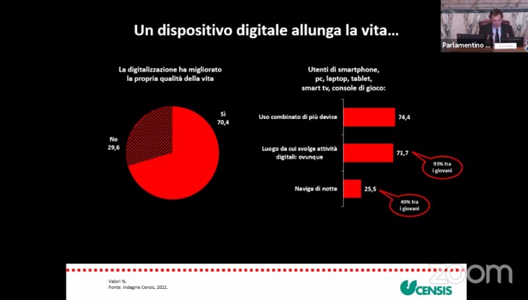 A illustrare il report Massimiliano Valerii, direttore generale del Censis, che, parafrasando un vecchia pubblicità di Telecom, ha subito sottolineato come un dispositivo digitale allunga la vita.