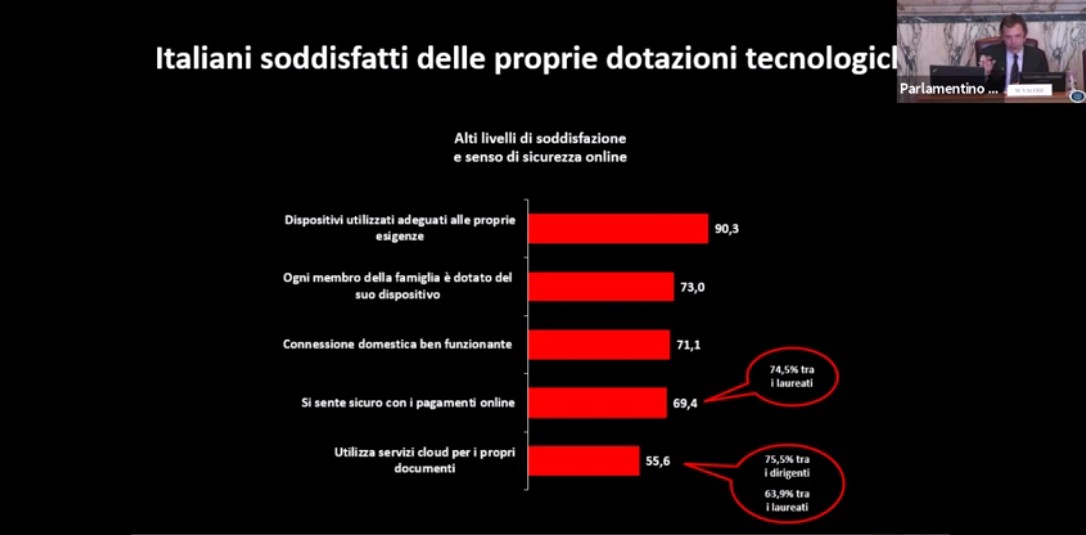 Un discorso importante lo riveste la sicurezza digitale. Oramai gli italiani navigano in rete con una certa disinvoltura. Di questi il 69,4% si sente sicuro quando effettua pagamenti o altre operazioni finanziarie online, un dato che sale al 74,5% tra i laureati. Più della metà (il 55,6%) utilizza almeno qualche volta i servizi cloud per salvare documenti e informazioni, con punte del 77,5% tra i dirigenti e del 63,9% tra i laureati.